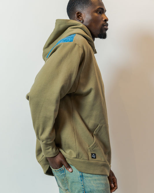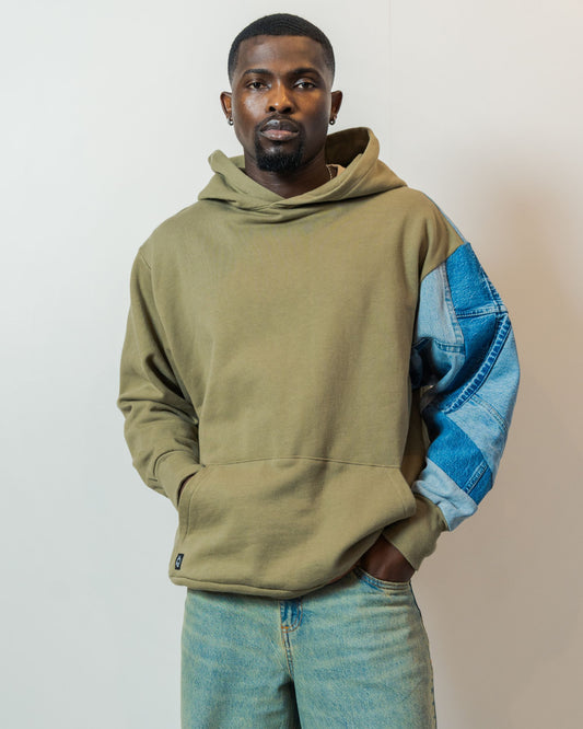 Olive & Blue Denim Patchwork Sleeve Hoodie L