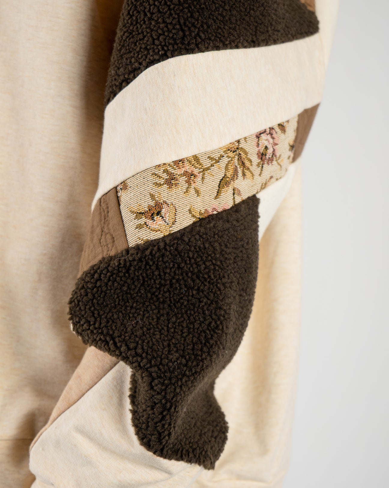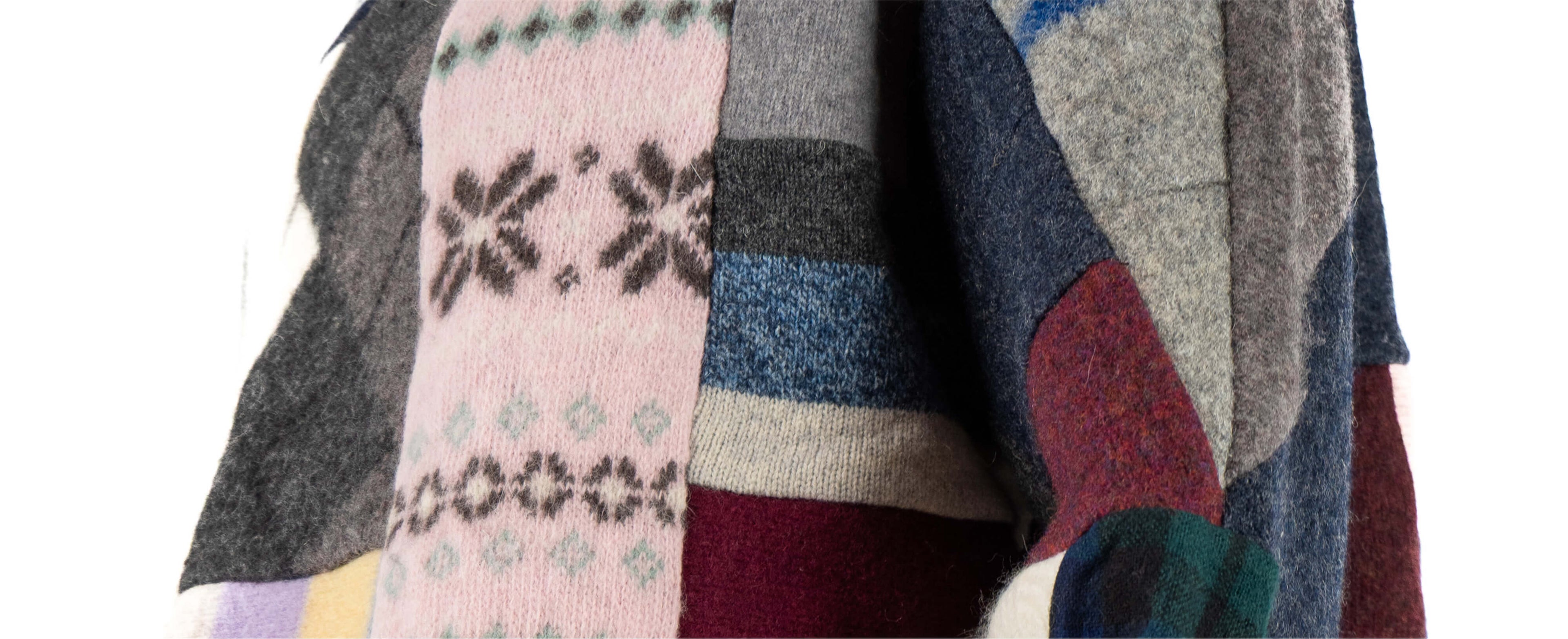 We sew small, irregular pieces together to create bold, often abstract designs. Every composition is unique, and every garment is one of a kind. just like you. Nothing is mass-produced, and nothing is wasted.